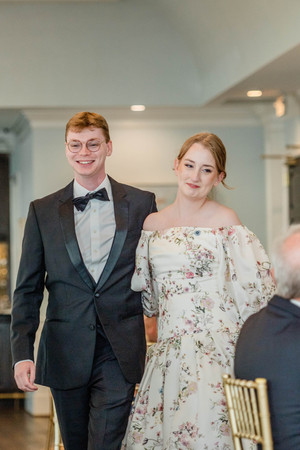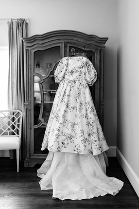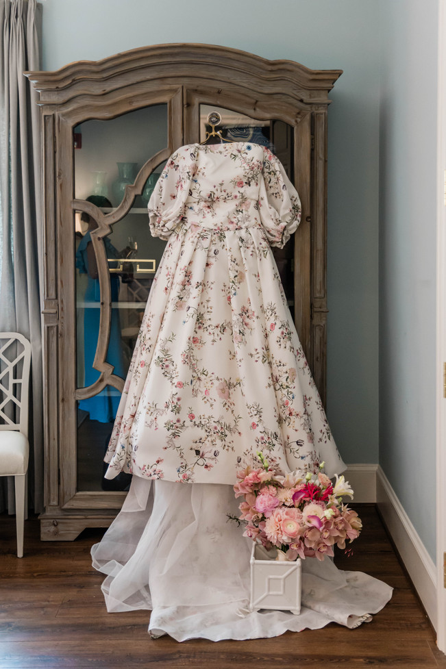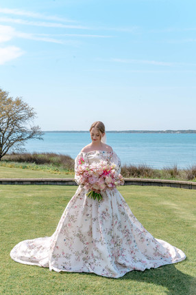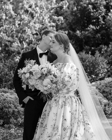 These gowns often feature intricate floral appliqués, soft fabrics, and flattering silhouettes that complement the early spring theme. Our bride looked stunning in her Tuilerie Gown - Draped off-the-shoulder ball gown with billowing sleeves and side slit in botanical printed Piqué gazar.