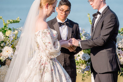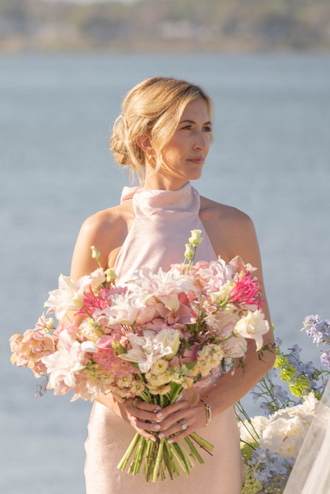 Choosing a Monique Lhuillier gown that added a layer of elegance and artistry to the wedding. Her floral details echo the natural blooms of the season and the venue’s garden-like settings, creating harmony between the bride’s attire and the environment.