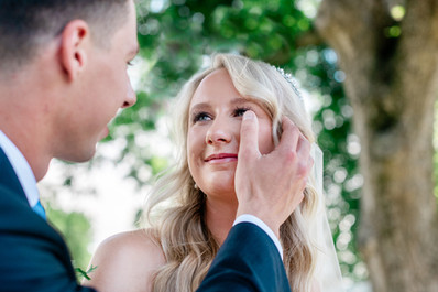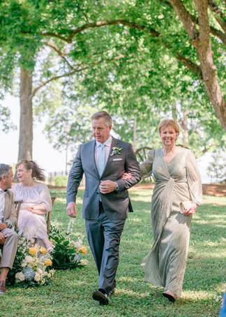Grooms can choose tailored suits in earthy hues or timeless styles to match the ambiance. Unique accessories—like an eye-catching tie or pocket square—add a personal flair. Grayson chose a traditional suit, with an accentuation on the tie color to match Savannah's vision of blues.